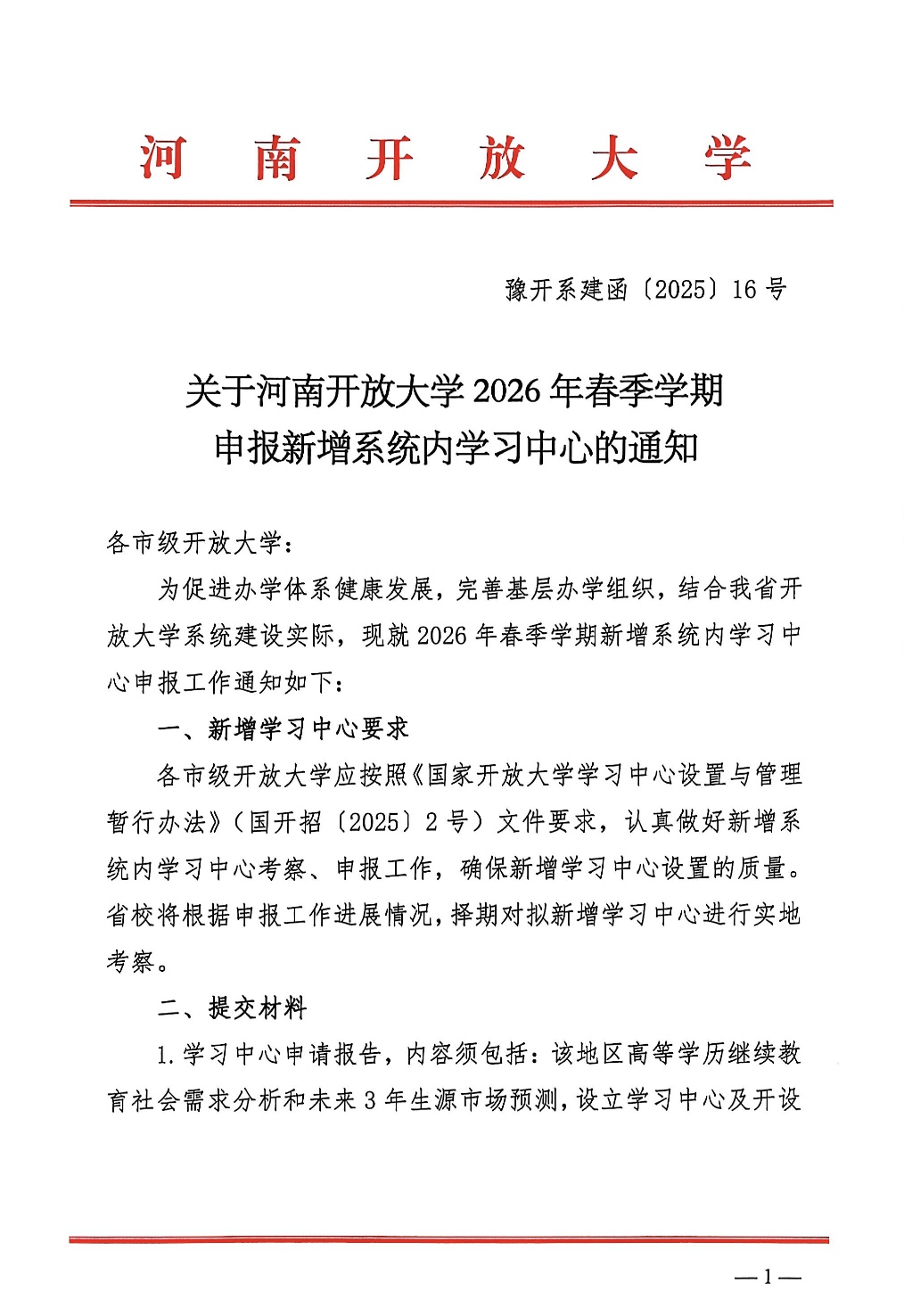 关于河南开放大学2026年春季学期申报新增系统内学习中心的通知
